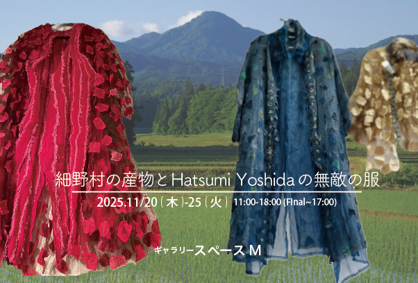 -   細野村の産物と Hatsumi Yoshidaの無敵の服細野村の産物と Hatsumi Yoshidaの無敵の服2025年11月20日(木)〜 25日(火)11:00- 18:00(Final~17:00)ギャラリースペース M ※20日午後1時からファッションショーをします。ぜひいらして下さい。 〒353-0004志木市本町1-2-2TEL.FAX 048-474-8486